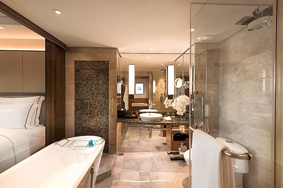 Spacious suite with a separate living room and a window with views of city skyline. Bathroom features a freestanding bathtub and a separate shower. The suite also comes with the Executive Lounge access.